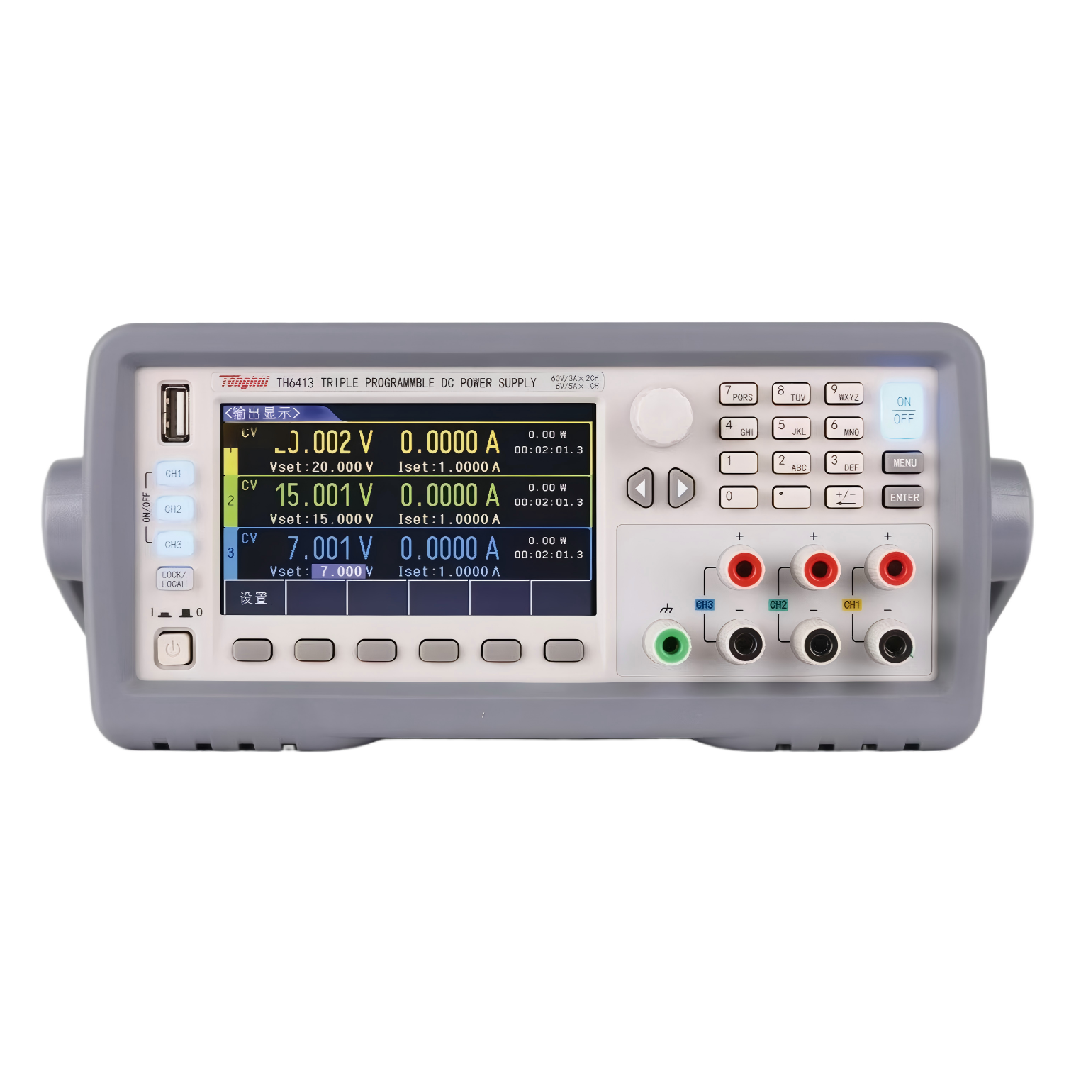 TH6400全系列配备4.3寸TFT LCD显示屏,所有通道的设置参数和输出参数同时显示在同一屏幕中。屏幕左侧对应于不同通道显示区域配备了每个通道单独输出按钮,右上角的总输出按钮用于所有通道同时输出或关闭。数字编码旋钮、数字键盘可快速准确地输入设置参数,避免了电位器调节带来的效率低下和不精确问题。