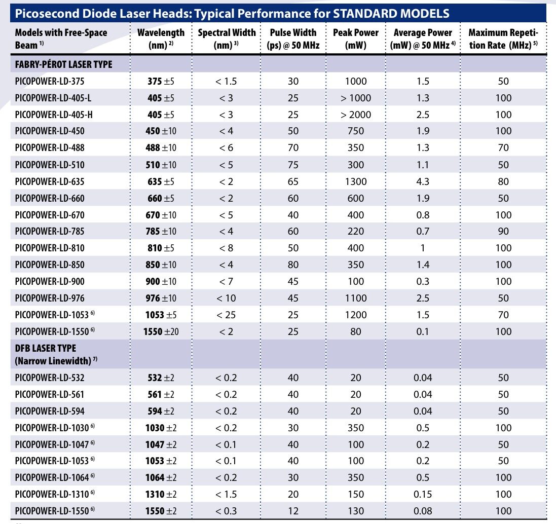 所有波长均可实现光纤耦合输出,采用单模SM或保偏PM光纤,典型耦合效率为25%至30%(例外:375纳米波长使用多模光纤)。