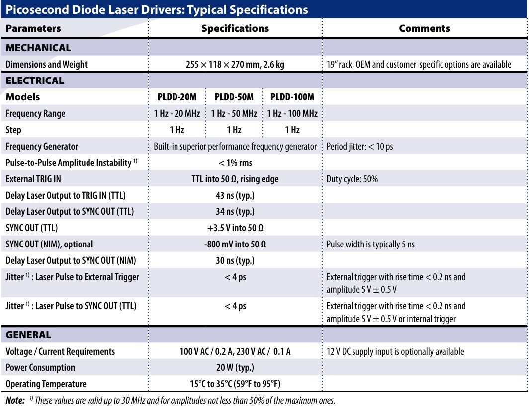 所有二极管激光器均可工作至100MHz或更高频率(特殊定制可实现,但峰值功率会降低且脉冲宽度增大)。